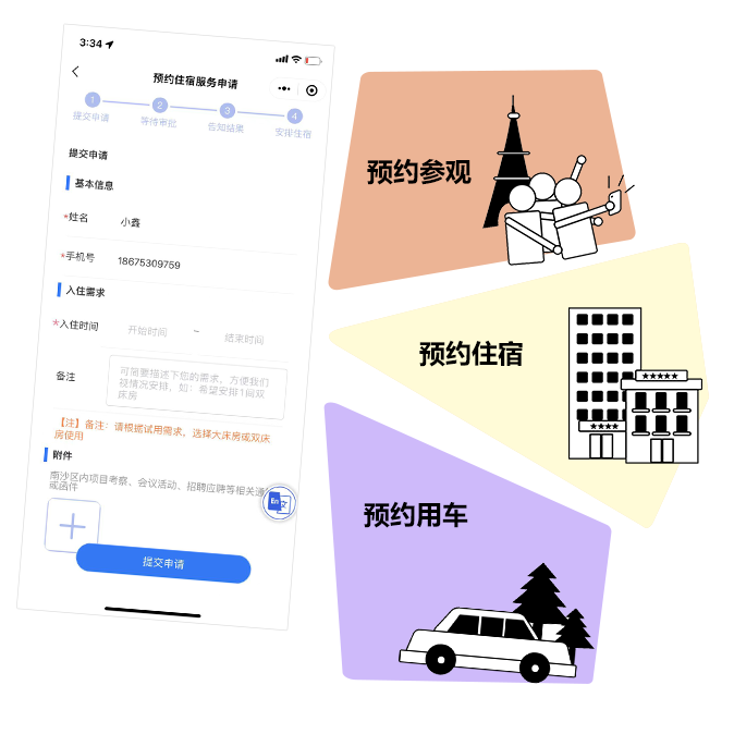 园区一站式预约服务 搭建园区预约服务系统,满足外来优质人才来到南沙享受多种便捷生活服务。 1、预约用车 2、预约住宿 3、办公服务 4、预约参观